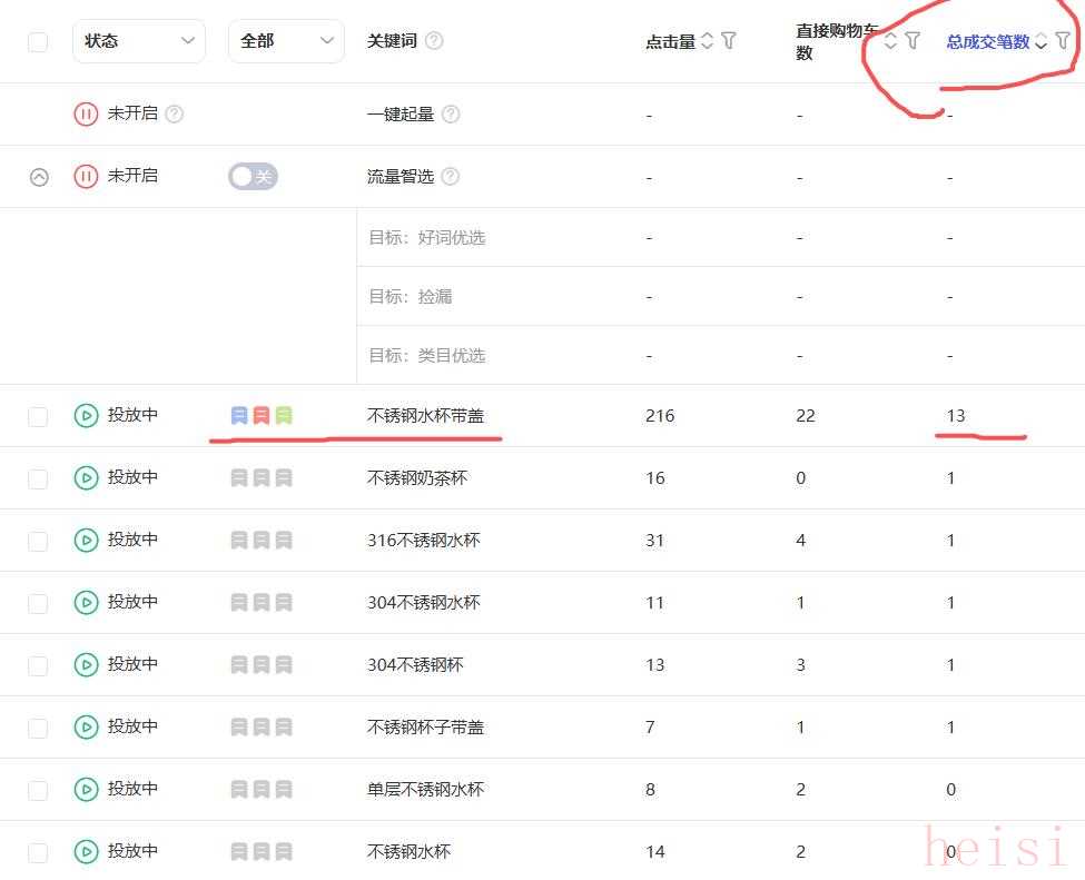 比如通过下图可以看出,在10个词中,【不锈钢水杯带盖】这个词转化最高,带来了13个订单,其他词带来的订单很少。