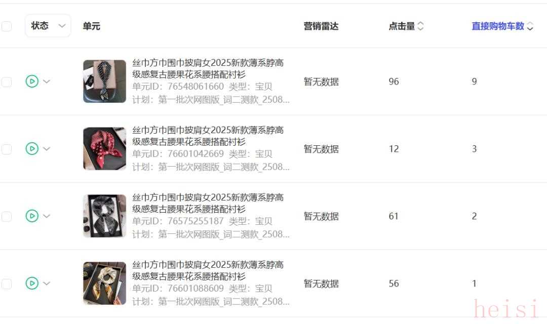 通过下图可以看到,4个丝巾产品,有的丝巾产品加购物车就很高,有9个,有的丝巾产品加购物车就很低。