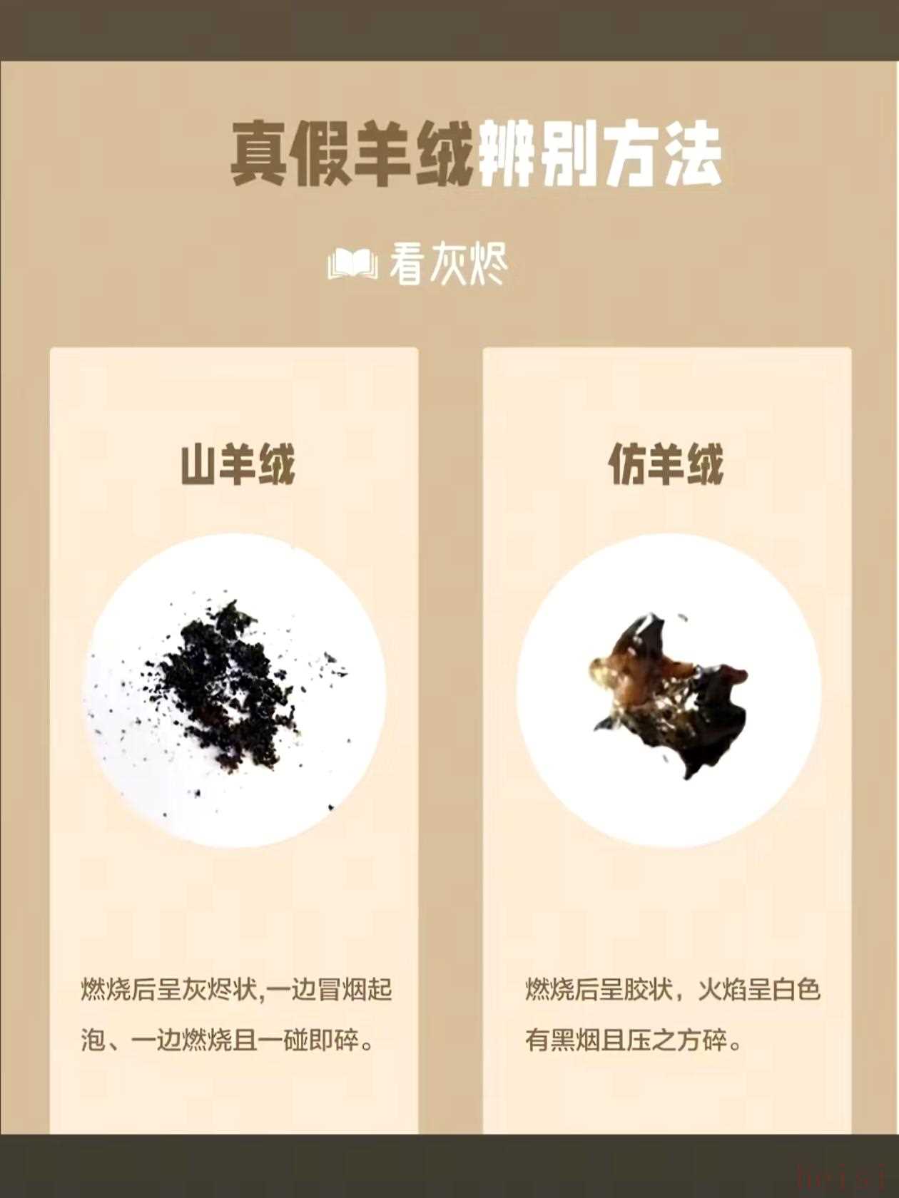 真羊毛:点燃后会像烧头发一样,有股焦糊味(蛋白质燃烧的味道),灰烬是黑色的粉末,轻轻一捻就碎。