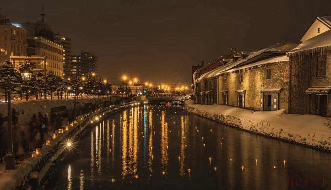 "小樽运河"的黄昏时分,河岸金黄,是摄影爱好者的天堂。浅草桥是拍摄的最佳地点。夕阳下,摄影师们聚集于此捕捉美景。煤油路灯和仓库群从傍晚亮至深夜,白天朴素的石仓夜晚变得迷人。