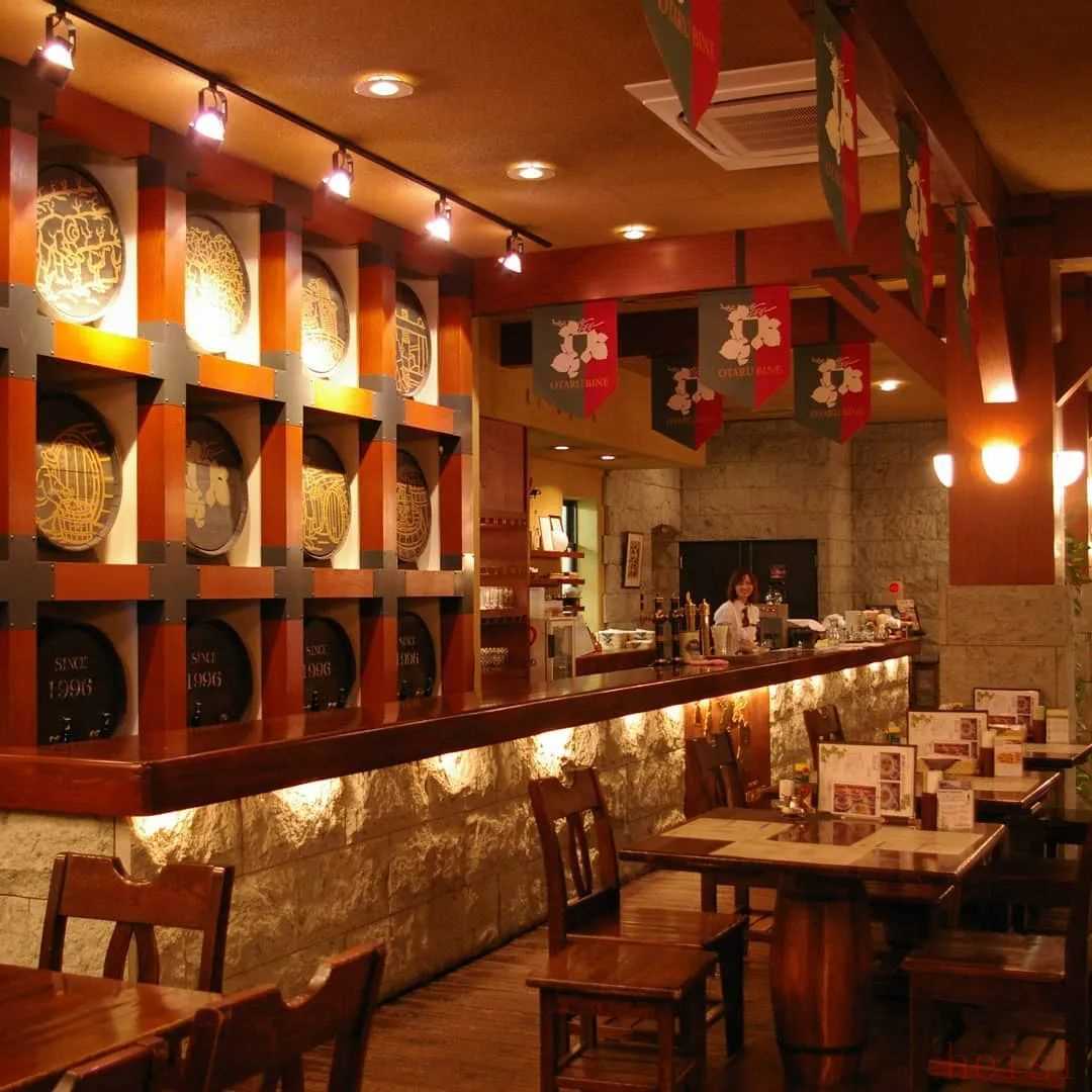 “小樽バイン”是明治石仓改造的小酒馆,以深色木质装饰营造沉稳华美氛围。主打小樽当地新鲜食材,提供多样菜色和手工薄饼披萨,搭配的红酒可购。