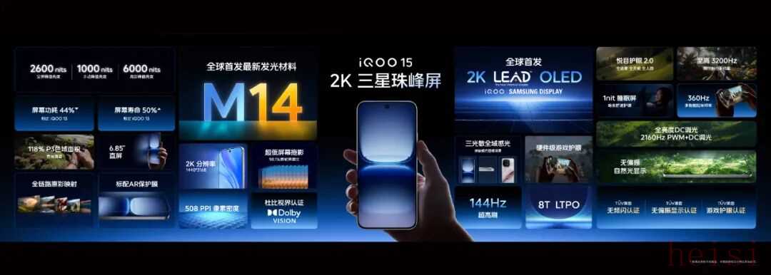 关注 iQOO 15 的网友已经在此前的宣传预热中了解到 iQOO 15 将会搭载一款越级旗舰顶级显示屏,官方命名为 2K 三星珠峰屏。具体规格上,该屏幕拥有 6.85 英寸、3168x1440 分辨率、144Hz 刷新率的基础规格,除此之外,该显示屏全球首发最新发光材料 M14,首帧亮度比 98.1% 疾速响应,可实现三光敏传感系统可在复杂光线场景中精准自动调节。同时全球首发 2K LEAD OLED,兼顾低功耗、绿色环保、高亮度特性。护眼与色彩现实方面,色域覆盖范围达到 DCI P3 色域面积的 1.18 倍、支持全链路原彩映射。全球首发悦目护眼 2.0,无偏振自然光显示、硬件级游戏护眼、行业最低 1 尼特屏幕亮度,并通过行业首个莱茵双护眼认证,无愧于顶级旗舰 2K 显示屏之名。