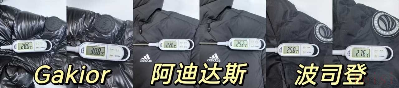 阿迪达斯户外款:含绒量不到90%,充绒量200g左右,清洁蓬松度700。经测,该款羽绒服6分钟内部温度达22.6℃,20分钟后升至25.2℃。产品设计更适配轻中度户外场景与城市轻度寒冷环境,比如初冬的通勤路或周末近郊徒步。