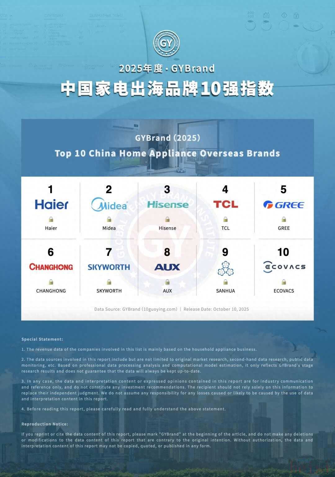 GYBrand“中国家电出海品牌10强指数”是一份全面展示新时代中国家电出海品牌最新成果的榜单,同时也是衡量当下中国家电出海品牌高质量发展的风向标。该榜单不以企业规模或营收为单一依据,而是基于海外市场的业绩、品牌建设、品牌贡献、可持续性等多元维度,通过专业市场调研、数据建模与行业分析综合得出,具有高度的专业性与权威性。