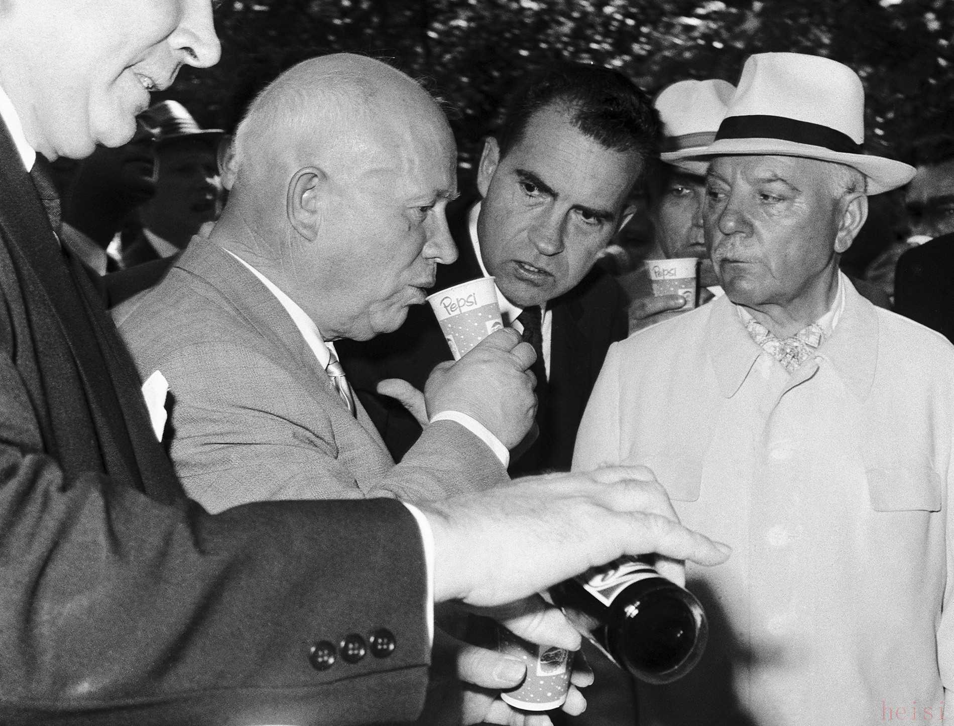 1959年,作为经济改革的一部分,莫斯科举行了美国工业产品展览会,副总统尼克松在老朋友百事可乐国际总裁唐纳德·肯德尔的委托下,领着赫鲁晓夫到展台品尝了一下百事可乐,这一刻历史惊人的相似,赫鲁晓夫也喜欢上了这种口味,他暂时忘掉了对玉米的爱,一下喝了六杯百事,在整个展览会期间,苏联公民一共消耗了300万杯百事。第二天,赫鲁晓夫举杯饮可乐的照片就登上了头版,可以说有第一领导人的加持比什么广告都有效,可口可乐这下傻眼了,心想同样是资本主义饮料怎么我当年没赶上这个机会?