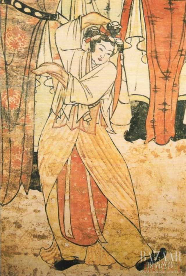 说到裤+裙的搭配,中国人可谓是老祖宗了。裙和裤的搭配,在三国魏晋之后便成了日常主流。当时除了女性最简单的围在腰上的短裙,各种各样的裙子的称谓如雨后春笋般涌现出来,比如单裙、复裙等等。只是年代太久,所以很难对上。而到了隋代之后,大家把这类裙子称为笼裙,比如《中华古今注》中说”隋大业中,炀帝制五色夹缬花罗裙,以赐宫人及百僚母妻,又制单丝罗,以为花笼裙,常侍宴供奉宫人所服。”大业是隋炀帝的年号,在这里其实说的应该是比较正式的服装。罗是当时十分常见的织物,似透非透、影影绰绰。在唐代的很多壁画中,如果仔细看,会发现当时的画师为了表现出这类织物的质感,在裙子里会仔细描裤子的线条。