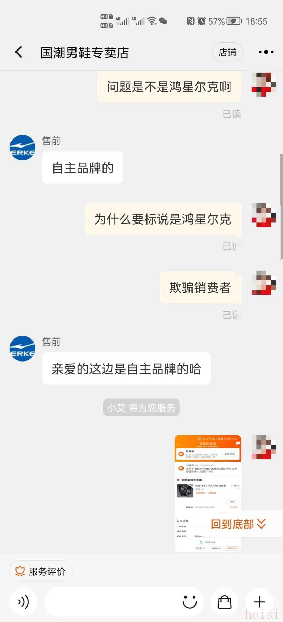 刘女士:客服就不正面我,我问你们这是不是鸿星尔克,他说他是自主品牌,我说自主品牌是什么意思嘛,我也弄不清楚。我就问了第二遍,客服还是这样说。