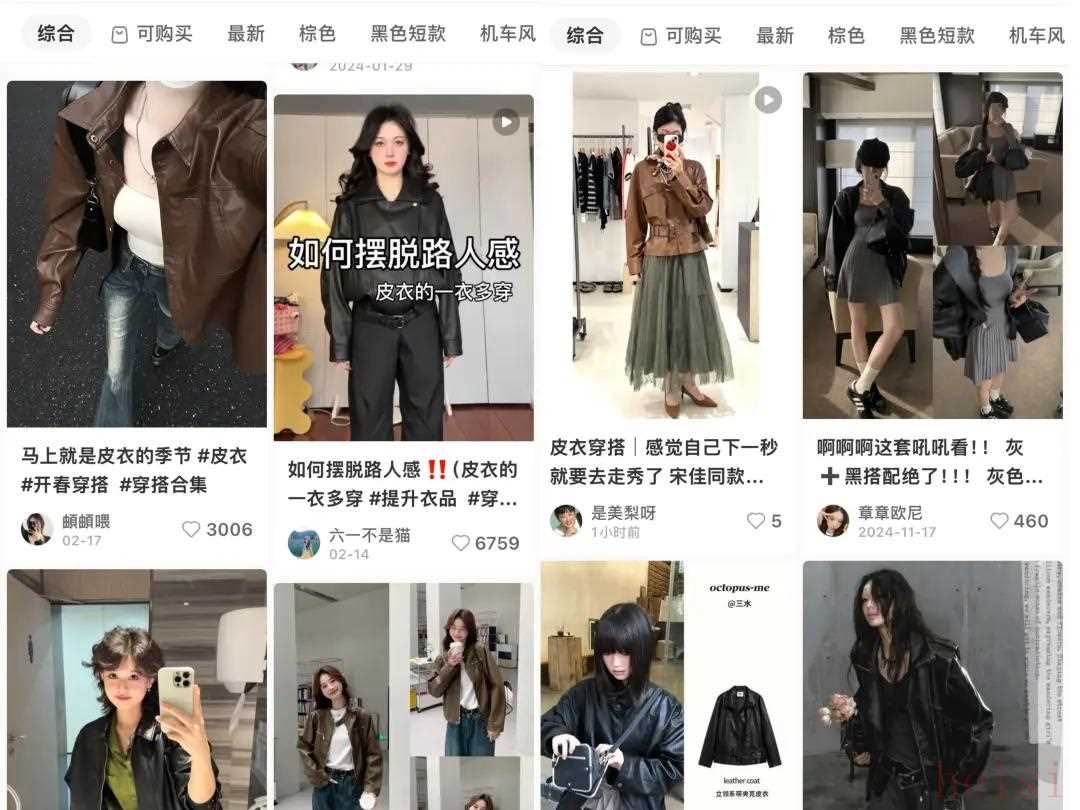 在小红书皮衣热门笔记中,“好搭配”、“松弛”、“随性”是关键词,除了经典的黑色、棕色皮革之外,焦糖色、棕红色等色系也受到不少用户的喜爱。在款式和长度上,更是有超短款、短款、超长款、飞行式、巴恩风等五花八门的多样选择。