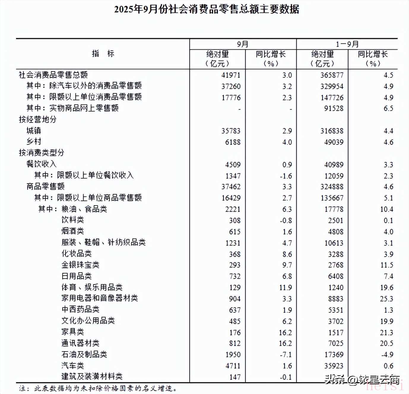 9月份,社会消费品零售总额41971亿元,同比增长3.0%。其中,除汽车以外的消费品零售额37260亿元,增长3.2%。1—9月份,社会消费品零售总额365877亿元,增长4.5%。其中,除汽车以外的消费品零售额329954亿元,增长4.9%。