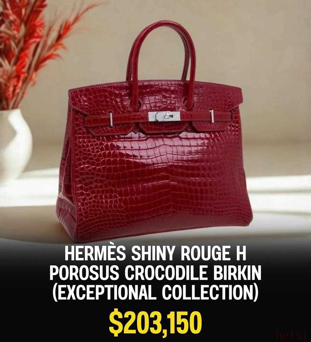9. Hermès 亮面H红波罗苏斯鳄鱼皮铂金包 ($203,150)这款被列为“特殊收藏”(Exceptional Collection)的铂金包,采用珍贵的波罗苏斯(Porosus)鳄鱼皮,以亮面的“H红”(Rouge H)色调呈现,其浓郁的色彩和完美的光泽是顶级皮革工艺的体现。