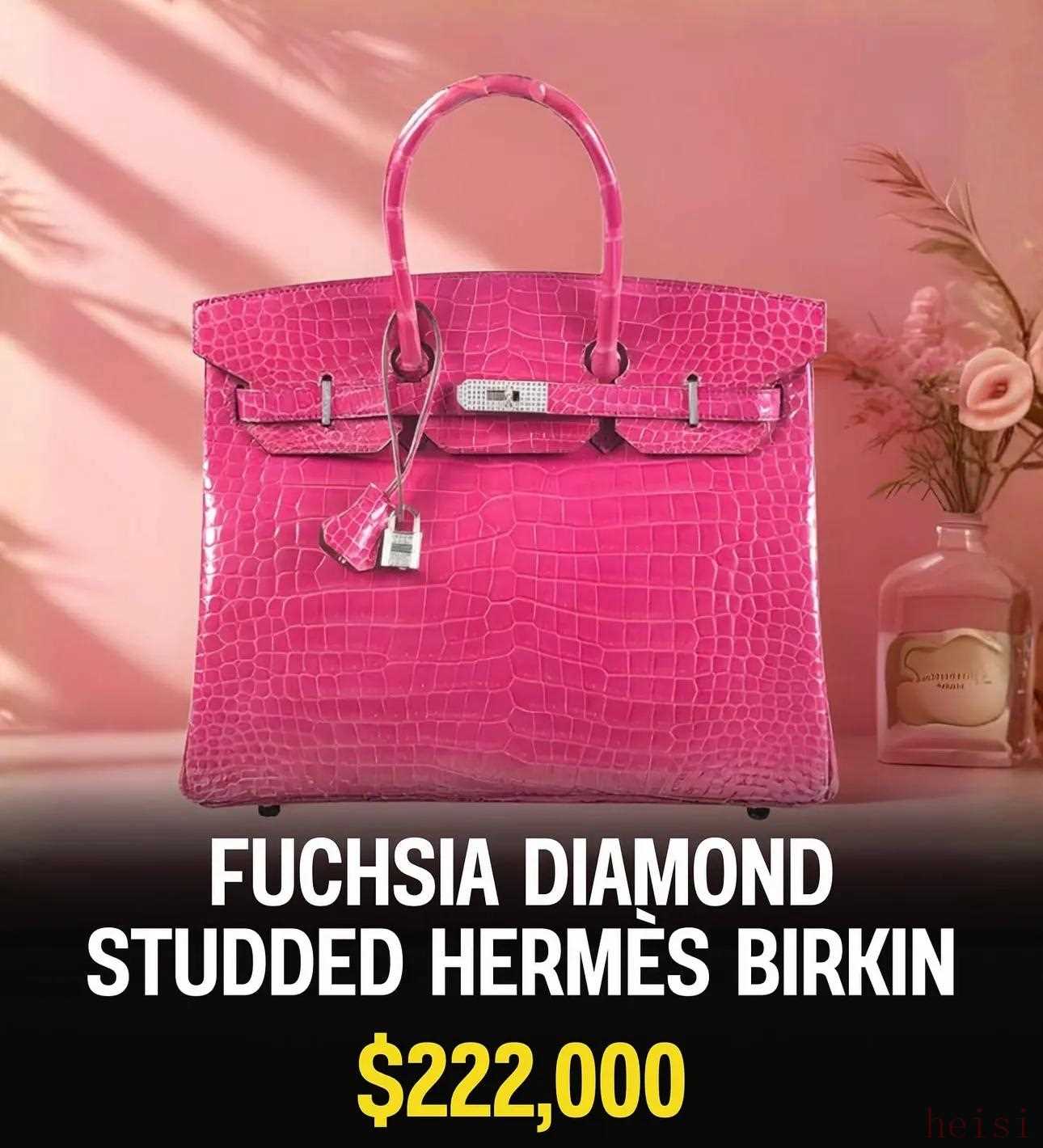 8. Hermès 紫红钻石铂金包 ($222,000)这款色彩鲜艳的 紫红色(Fuchsia)鳄鱼皮铂金包,搭配白金镶钻的锁扣和钥匙,在拍卖市场上备受追捧,体现了稀有颜色对价格的巨大推力。