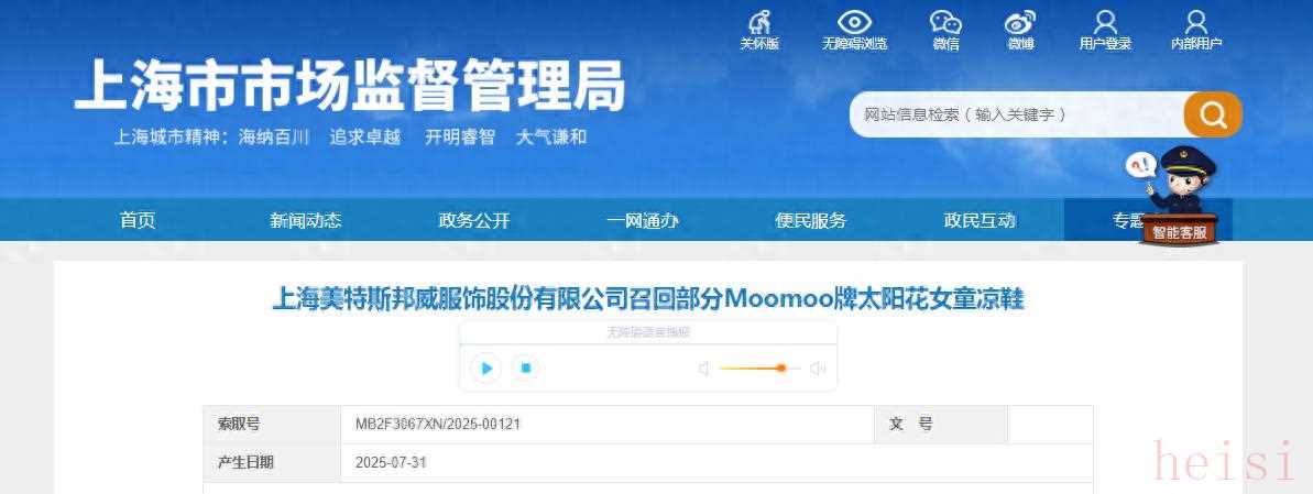 这是一条关于上海美特斯邦威服饰股份有限公司召回部分Moomoo牌太阳花女童凉鞋的消息。
