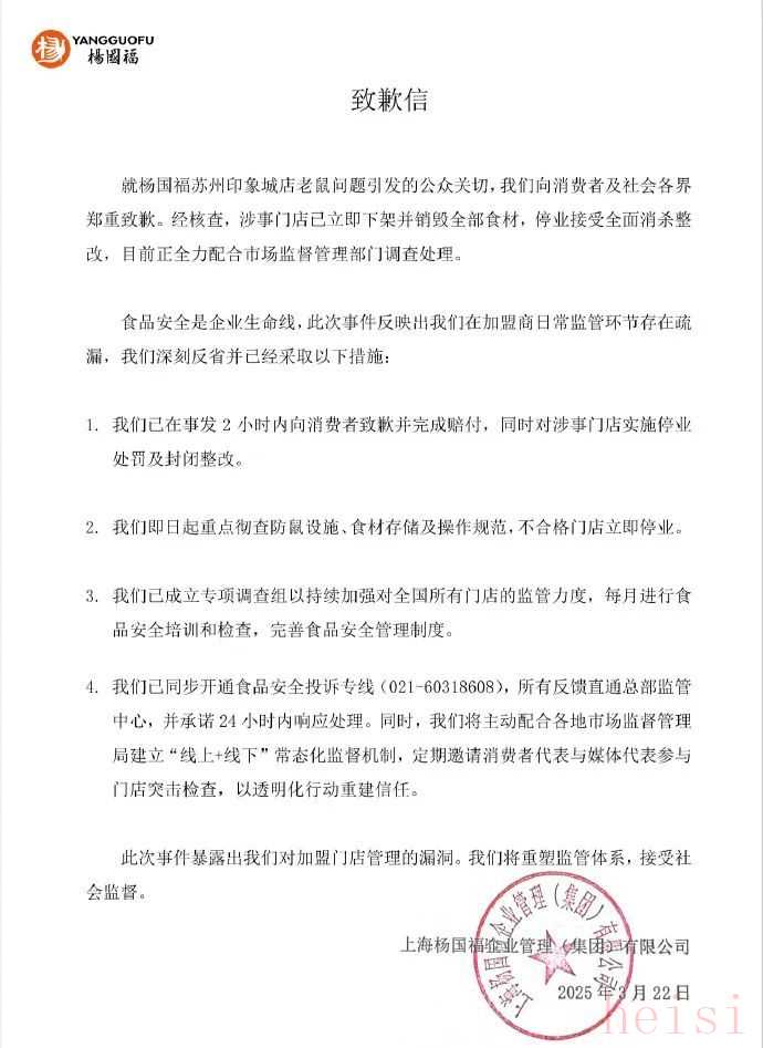 就杨国福苏州印象城店老鼠问题引发的公众关切,向消费者及社会各界郑重致歉。经核查,涉事门店已立即下架并销毁全部食材,停业接受全面消杀整改,目前正全力配合市场监督管理部门调查处理。