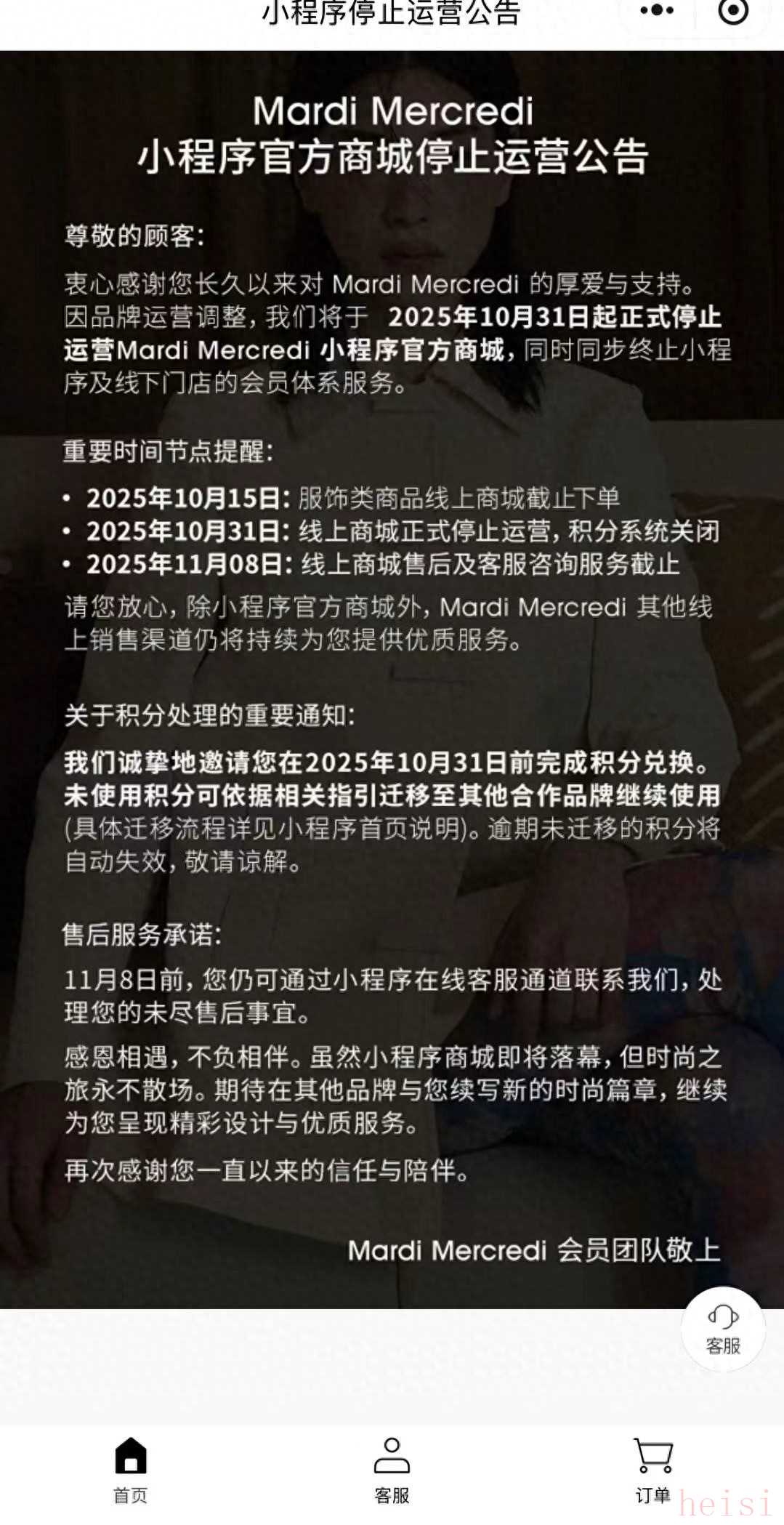 韩国设计师潮牌Mardi Mercredi即将关闭其在中国的全部门店,该品牌小程序商城自10月31日起停止运营。