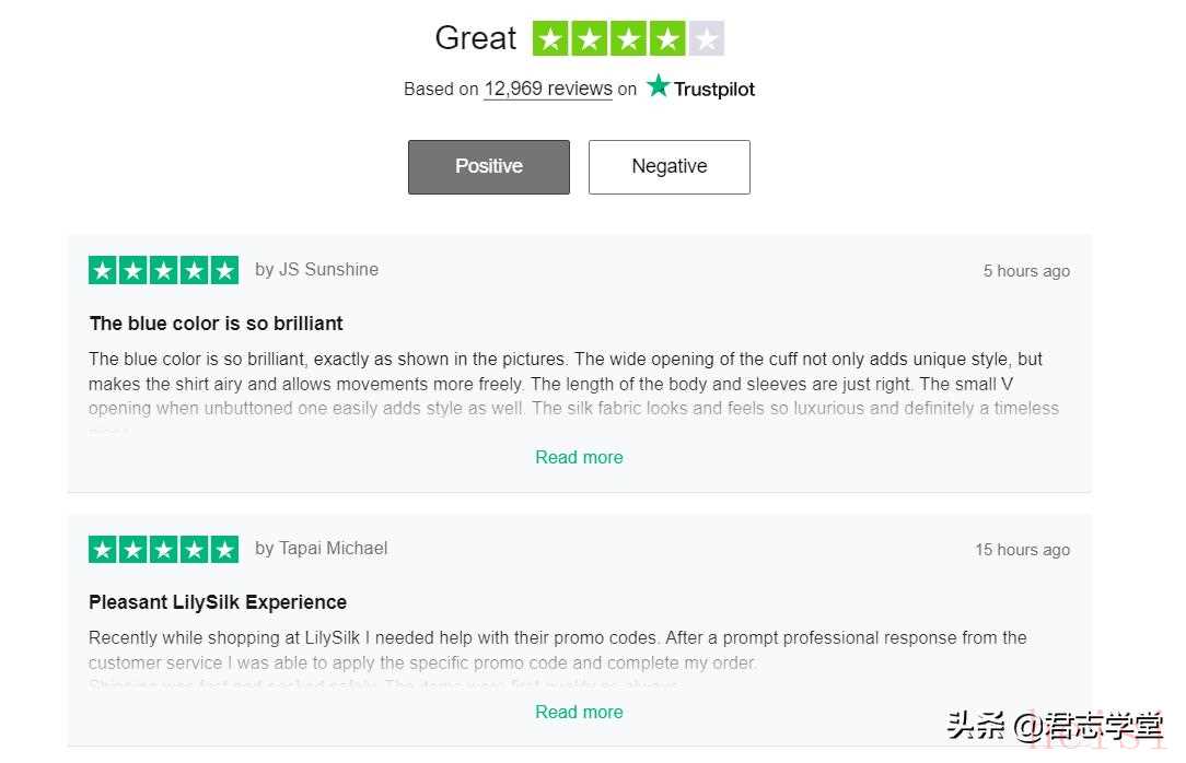 4、锦上添花的客户服务Lilysilk有着长达60日的退货窗口,并以此为产品销售做背书,且第一次从美国退货的用户,不需要支付邮费,可以说是非常贴心了。除此之外,及时的客户服务、超详细的交付时间、完善的FAQ问答体系以及精美的产品包装等都是品牌用户运营中耍的“小心机”。在独立站产品页面中,Lilysilk还接入了知名在线点评社区Trustpilot用于收集用户的评论,以便能及时作出处理。