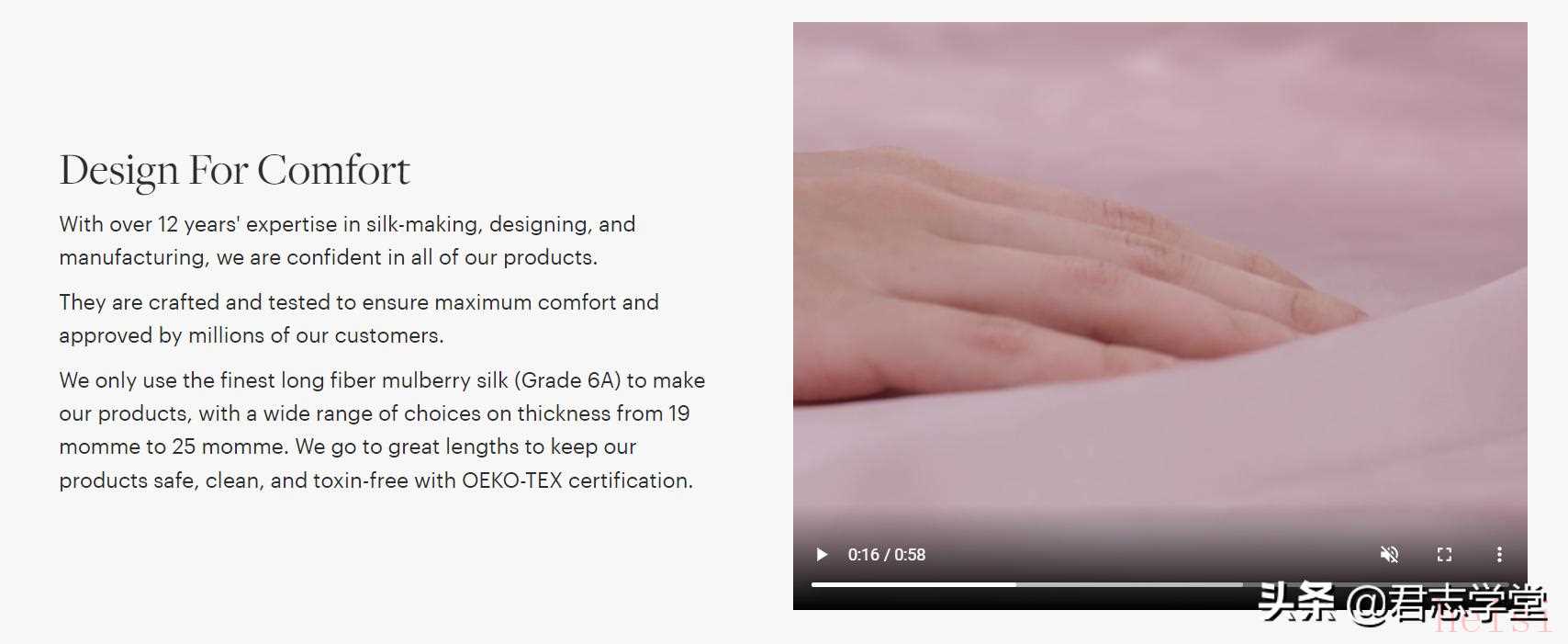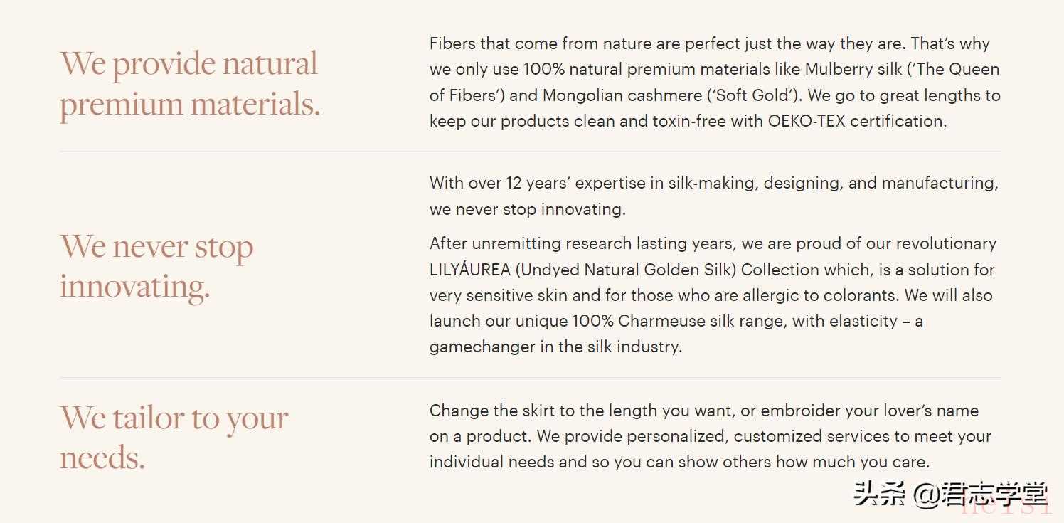 五、品牌建设要说Lilysilk与其它出海品牌区别开来的就是它对自身品牌建设的重视了。其实很多出海品牌商家都会在独立站首页放置大量的打折信息、产品展示信息,并摆放许多产品入口,而Lilysilk则不一样,它在独立站品牌展示中花费了许多心思。虽然首页中也有部分折扣信息及爆款产品的展示,但还是讲述品牌故事以及品牌文化的篇幅居多,主要包括品牌的原材料、生产的严谨态度、公司坚持的慈善活动、获得的国际认证等,这些都有利于品牌形象的塑造。