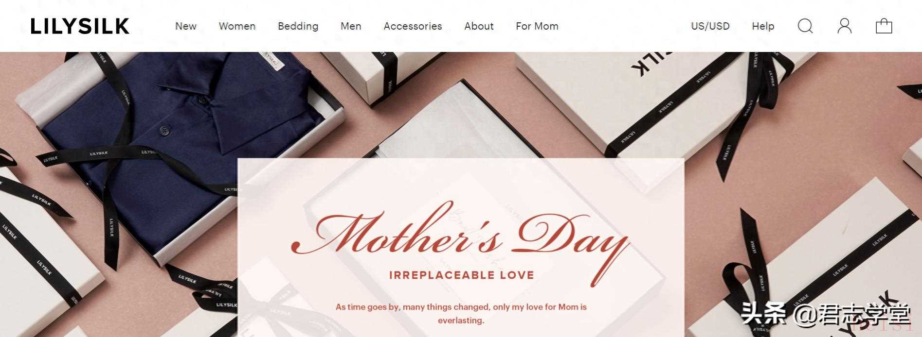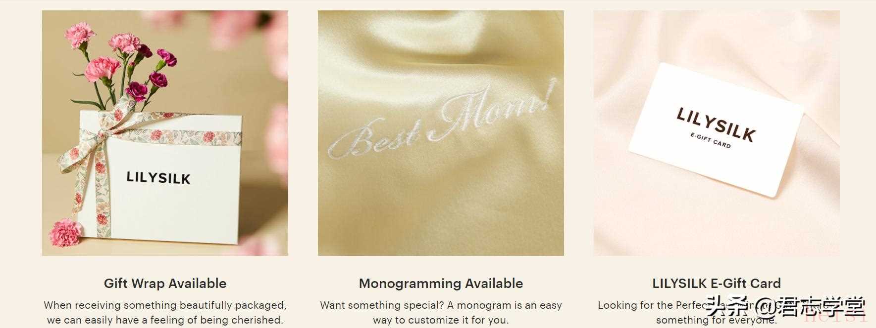 三、站内营销1、母亲节预热进到LilySilk的网站首页,可以看到品牌已经在为即将到来的母亲节促销活动做铺垫,其不仅为用户提供购买折扣,而且贴心赠送礼品服务:免费礼品包装、免费字母组合以及电子礼品卡。