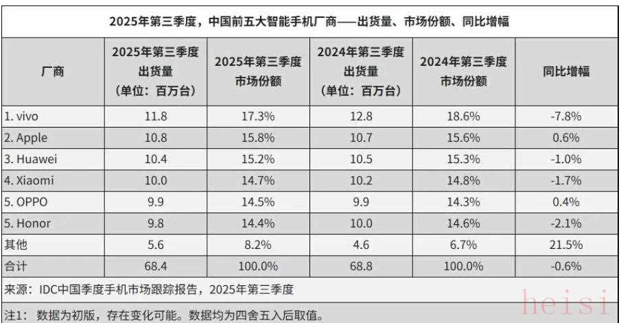 接着看中国市场的数据,如上图所示,总销量为6840万台,前6名分别为VIVO、苹果、华为、小米、OPPO、荣耀。
