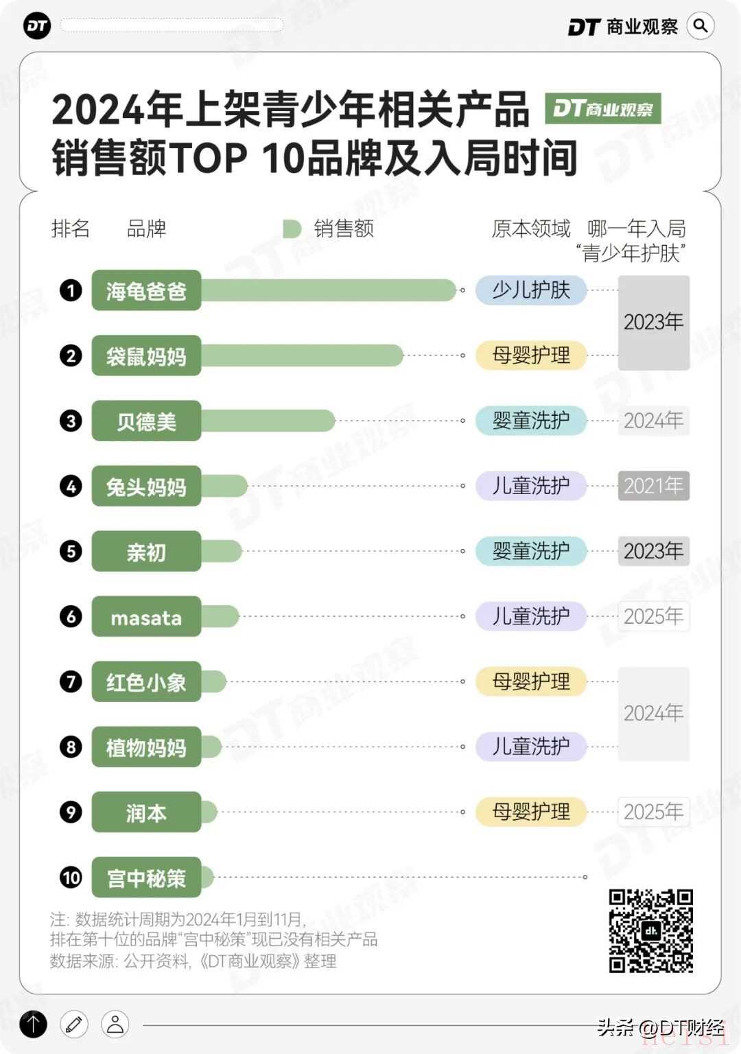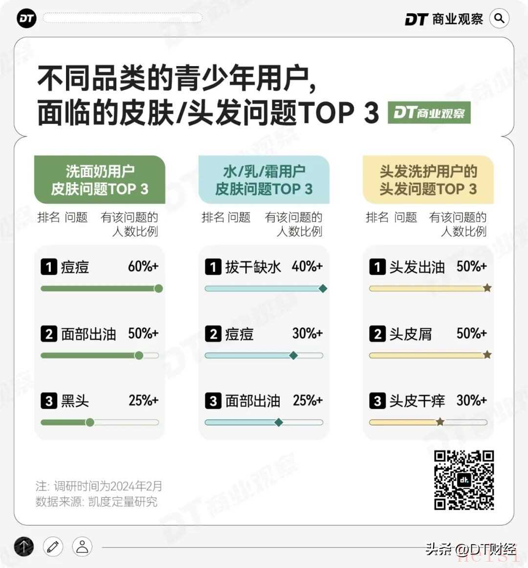 写在最后不管是从孕产护肤起家的袋鼠妈妈,还是瞄准“儿童防晒”的“海龟爸爸”,这些品牌之所以能在“美妆护肤”这片卷生卷死的海里分到一杯羹,原因还在于紧紧抓住一个细分人群,找到他们的真实痛点,然后“做精准”、“做深入”。不过,青少年护肤赛道虽然新且有潜力,但针对这一行业的相关规范和产品标准还存在一定的缺失。比如,很多青少年都会面临 “长痘” 困扰 —— 从常见的黑头、白头粉刺,到红肿的炎性痘痘,这些都是真实存在的皮肤痛点,市面上打多数青少年护肤品也因此主打 “祛痘” 的概念。但需要注意的是,“痘痘” 只是我们日常口头商的俗称,其背后可能包含结节、囊肿等更严重的痤疮类型,这类问题往往单靠护肤品难以彻底解决。因此,《DT商业观察》在关注潜力赛道、黑马品牌的同时,也期待更多产品和行业规范的出炉。