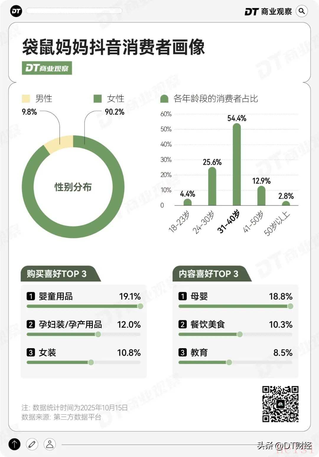 更重要的是,青少年虽然是这些护肤品的实际使用者,但大部分情况下,他们的妈妈,才是做消费决策或者提供消费参考的人。凯度2024年的定量调研显示,青少年洗护品的主要决策者82%是“妈妈”。而袋鼠妈妈的最初一批消费者,就是“妈妈群体”。创始人潘美红在公开采访中提到,袋鼠妈妈做青少年系列的启发来源于用户。十年前那批曾经在生育阶段购买过袋鼠妈妈产品的消费者,现在,他们的孩子到了青春期,“当时在袋鼠妈妈婴童洗护产品的直播间里,很多妈妈提问,这款护肤品我10岁、12岁的孩子可以用吗?”根据第三方平台,袋鼠妈妈的抖音消费者,有9成为女性,31到40岁的占比超过一半,购买喜好集中在婴童用品、孕产用品和女装。可以说,“青少年系列”产品看上去是开拓了新的人群,但其实,袋鼠妈妈做的还是同一个细分人群的生意。