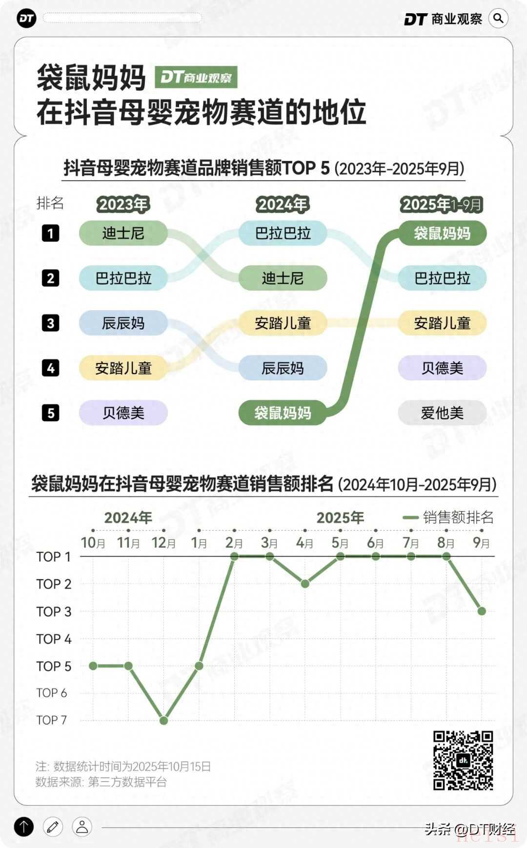 本篇原创文章源自微信公众号:DT商业观察,ID:DTcaijing,作者 / 张晨阳@a18811650028、编辑 / 郑晓慧@mersailles、设计 / 戚桐珲、运营 / 苏洪锐。母婴赛道,跑出来一个新黑马。《DT商业观察》发现,在抖音电商母婴宠物这个大品类下,一个名为袋鼠妈妈的品牌冲到了行业第一,超过了巴拉巴拉、安踏儿童等知名品牌。不仅是抖音,今年前9个月,袋鼠妈妈在全网电商渠道(抖音、京东、淘宝、天猫)销售额同比增长231%,可以说是一个在快速增长的黑马品牌。