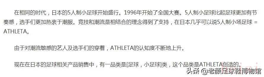 但是当时的日本市场,是全世界各大品牌争夺的战场,世界上所有知名的足球品牌在日本几乎都能买到。阿什利塔这种在巴西生产球衣的小品牌根本不入流,所有他们只能剑走偏锋,继续做服装,而且是日本室内五人制足球的服装。在一篇吹过头的软文中,号称在日本五人制足球等于阿什利塔,还说阿什利塔创造了小足球的品牌类目。在早年的职业足坛,阿什利塔的足球鞋肯定是莫须有的,这个品牌连个鞋身的logo都没有设计出来,根本没什么底蕴可言。那么为什么阿什利塔敢吹如此大牛,因为在2016年,他们赞助了巴西室内足球皇帝法尔考,所以敢言过其实,其实法尔考早年是穿茵宝室内球鞋的,而且还在2012年获得了五人制世界杯冠军,茵宝咋就从来没提这茬。