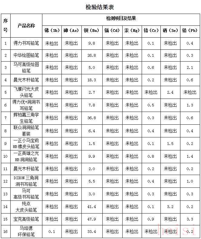 最高为宝克高级铅笔(3.3 mg/kg),其余多在0.2-1.4 mg/kg之间全部达标;