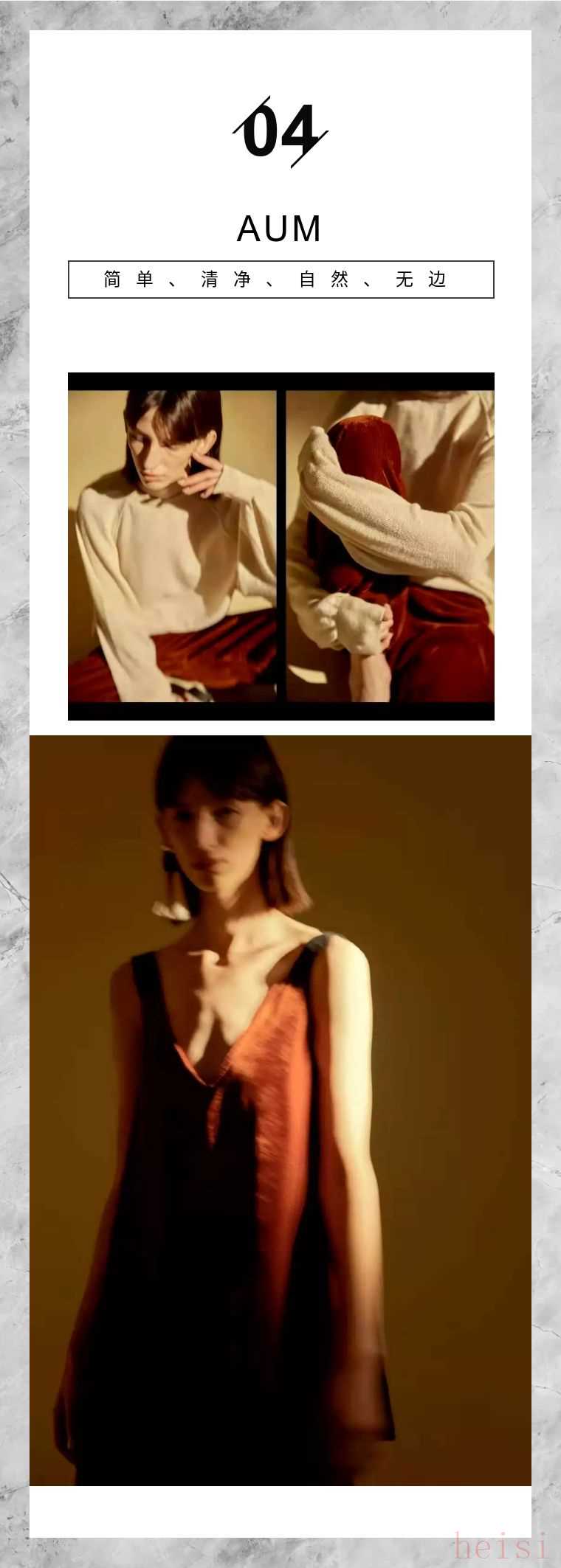 AUM的成衣多以舒适随性又带有设计感的简约廓形为主,或淡雅或浓郁的色彩运用也体现出当今都市女性独立、纯真、率性、简单的形象。