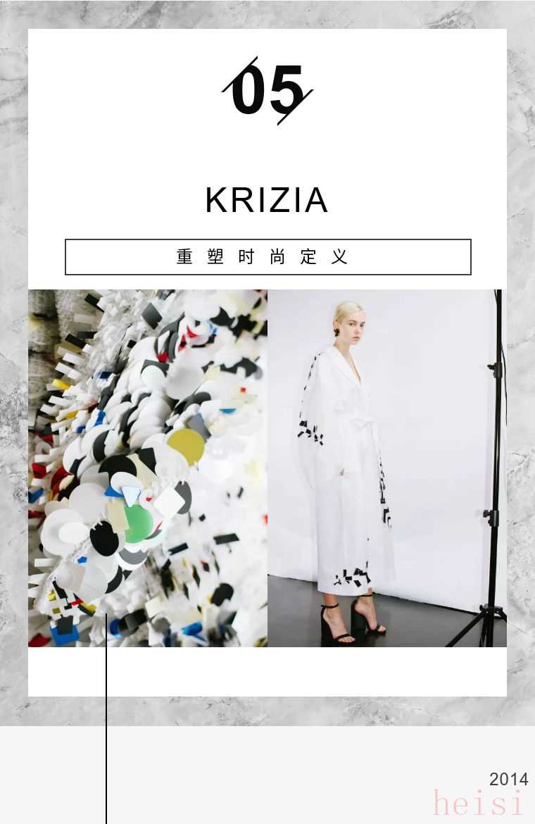 KRIZIA是一个集创意和奢华于一体的品牌,设计师们利用不断的研究,发明和意想不到的细节。将意大利式的优雅几何作为标志。品牌以褶皱、动物、金属在服饰上的广泛应用作为主要元素体现在成衣上。KRIZIA是一个开放的品牌,展现好奇,坚强和独立的当代女性气质。