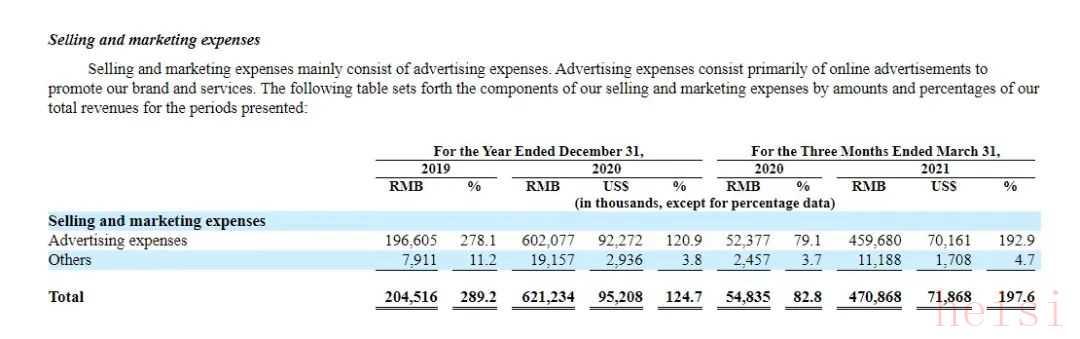 今年前三个月,soul市场营销费用已达4.71亿元,为技术开发费用0.82亿元的近六倍。背后是大幅增长的广告费。2019年和2020年,Soul广告费用分别为1.966亿元和人民币6.02亿元,分别占其总营收的278.1%和120.9%。2021年前三个月,其广告费用4.597亿元,同比增长784.04%,占其当期总营收的192.9%。soul也预计,随着业务扩展,其广告费用绝对金额将继续增加。