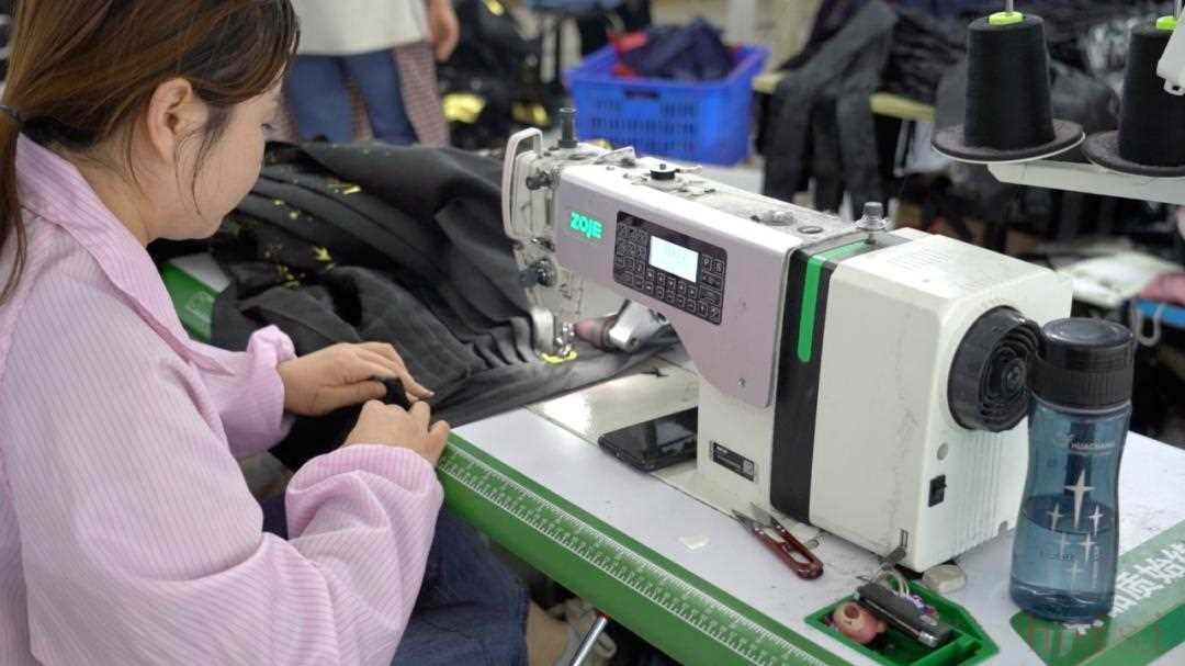 一台机器一分钟能绣出花纹,一名熟练工十几分钟能缝出一件衣服。