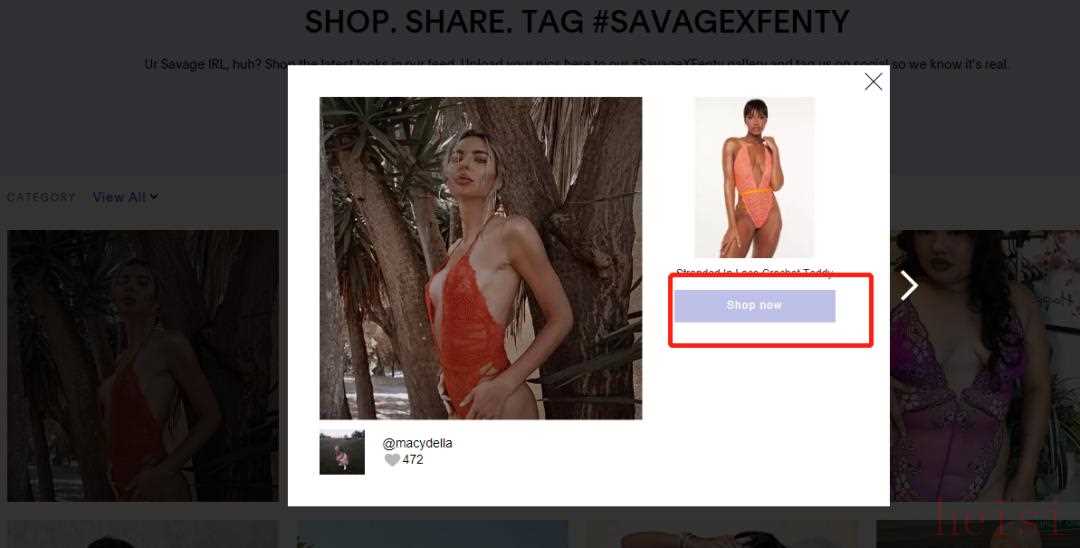 我们可以看到在品牌网站上,他们收录了许多购物者的创作内容,并且展示的图片都很抓人眼球,浏览网站的用户对于感兴趣的单品点击查看后,可以通过“shopnow”跳转到购买页面。