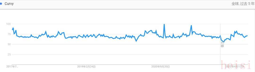 自从SavageXFenty增加“Curvy”这个类目,可以发现不少品牌也开始将这一小众类目加到了自己的销售表中,越来越多零售商明白“曲线”的意义以及市场的需求。自2017年开始,有关“Curvy”的搜索热度就一直处于高位。