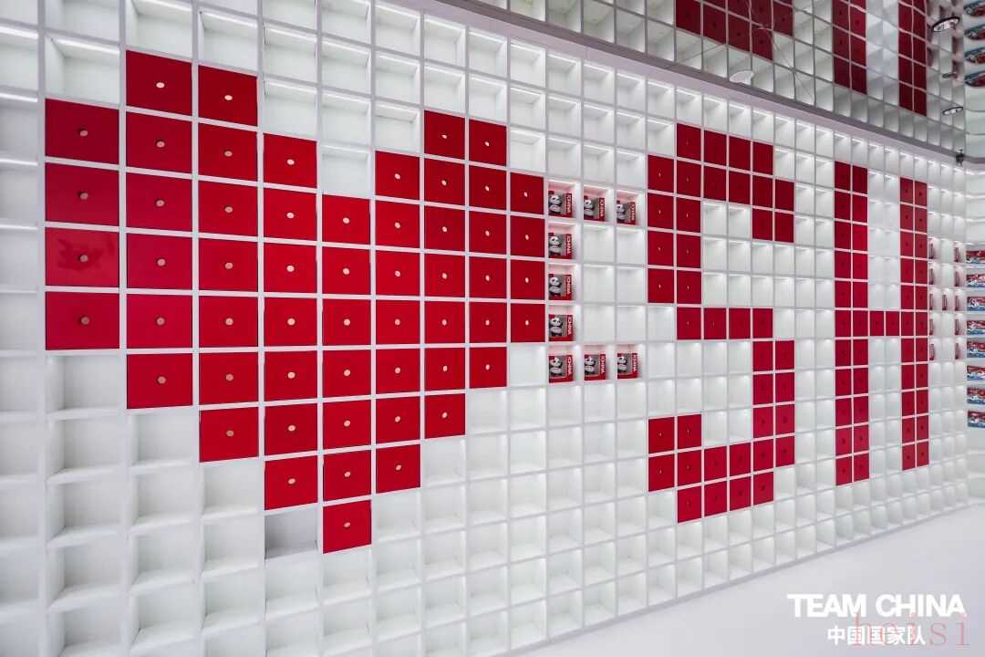 沿着这条“红带”,顾客可以依次体验三大功能区:入口展览区以互动装置、多媒体展陈激发对体育文化的兴趣;紧接着进入中部多功能活动区,深度体验商品特性;最后到达沉浸式商品陈列区,一面白色通高展格,集中展示国家队全系列徽章产品。