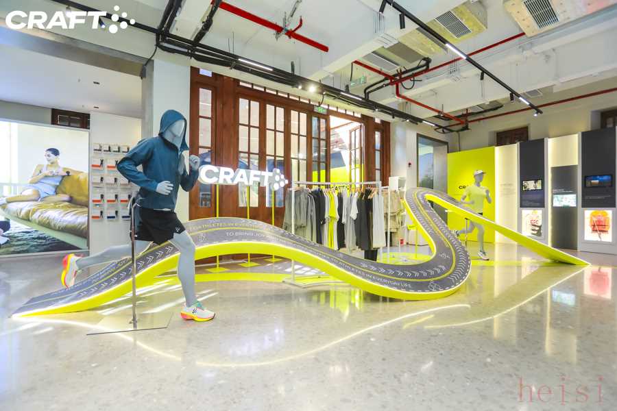 新民晚报记者注意到,Craft张园品牌体验店保留了百年历史建筑的原有风貌,同时注入现代北欧设计元素,明黄色调与古朴建筑形成鲜明的视觉层次。门店主体采用环保再生材料,体现可持续设计理念;空间入口处的无限透镜装置将奔跑人形与建筑元素结合,成为引人驻足的打卡体验点;店内中央区域以跑道为设计元素,又自然形成"回"字形参观动线,营造动态立体的运动氛围;另外特别设置了沉浸式跑步体验区,模拟多种路况环境,供顾客测试装备性能。