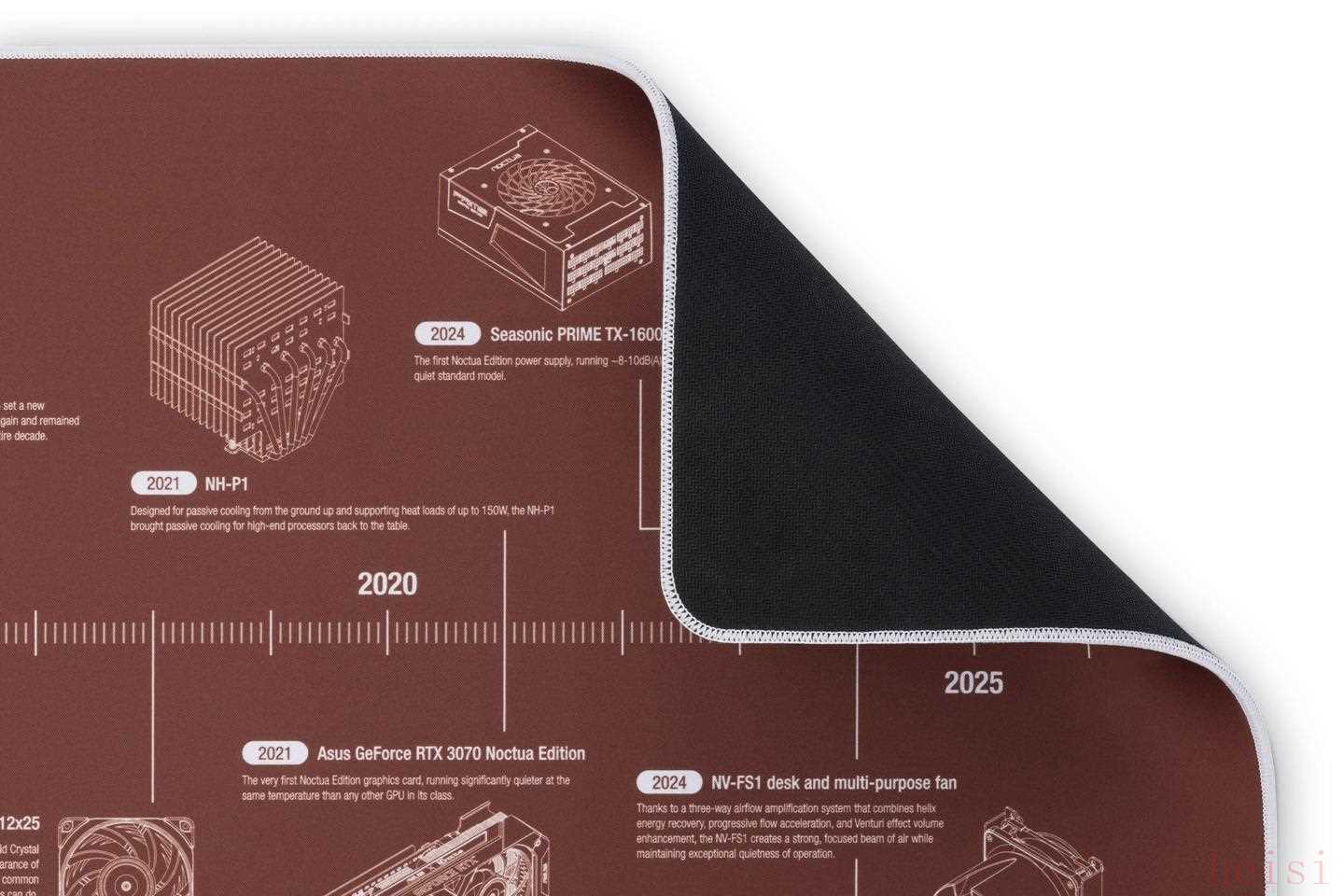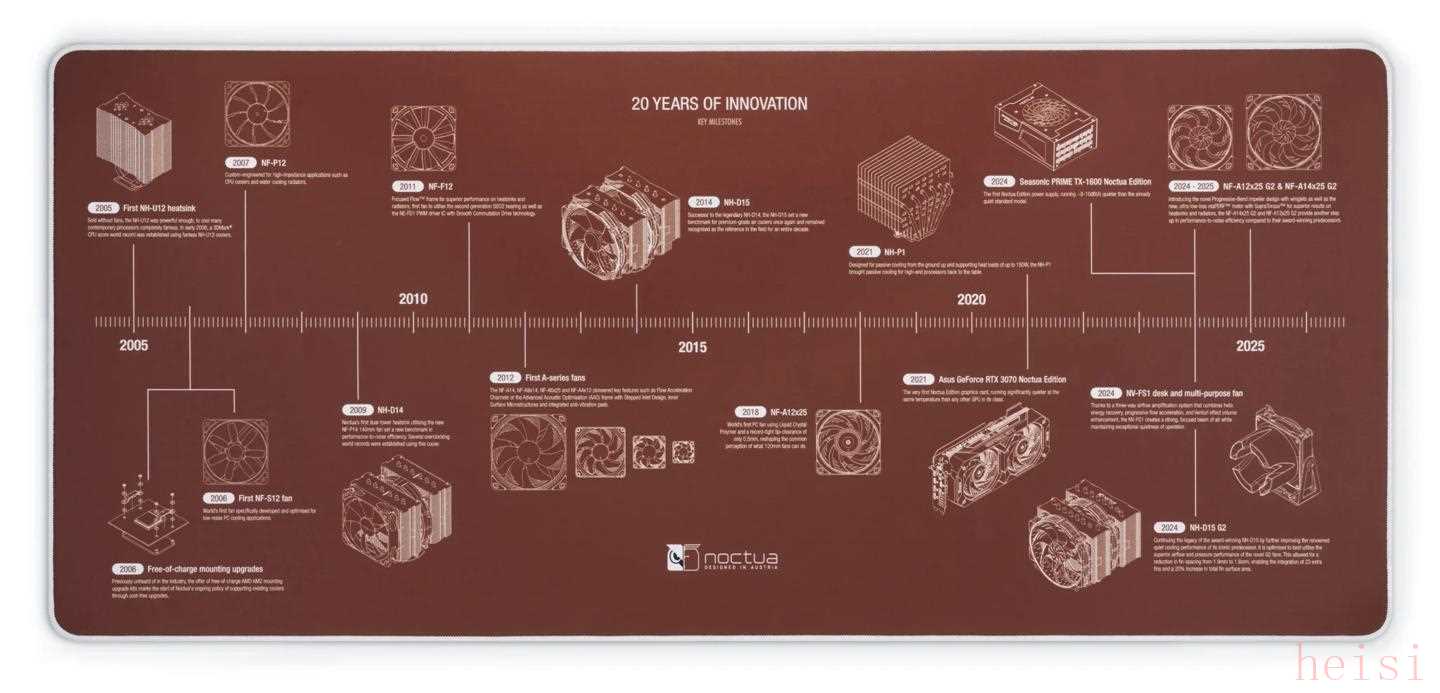 IT之家援引博文介绍,此次发布的 NP-DM3 纪念桌垫以时间轴的形式,在 90x40cm 的垫身上印刻了 Noctua 过去二十年的关键产品,从初代的 NH-U 系列散热器到 NF-S12 风扇,再到最新的 G2 系列。