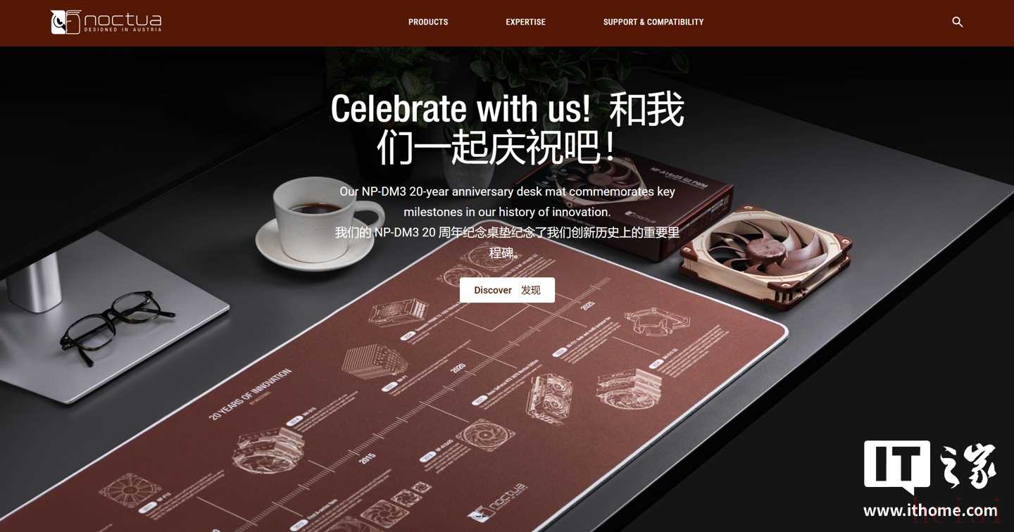 IT之家 10 月 24 日消息,科技媒体 Igor's Lab 今天(10 月 24 日)发布博文,报道称猫头鹰(Noctua)为庆祝品牌成立 20 周年,彻底革新其官方网站,并推出 NP-DM3 纪念桌垫。