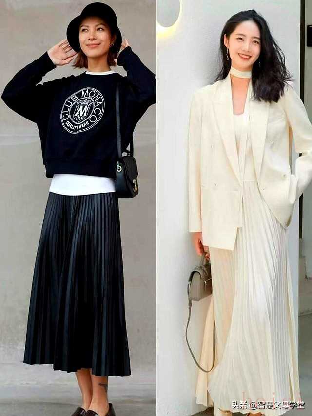 纯色、百褶、针织各准备一条,就能搭配出很多造型。