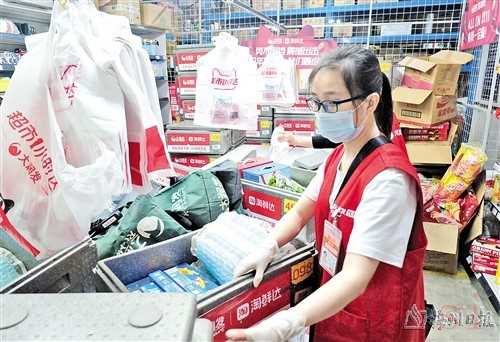 “疫情期间,消费者主要通过大润发优鲜APP、淘宝APP的淘鲜达频道等线上平台下单,早上8时至晚上8时的订单将在当天配送,大家可以预约时间,也可以选择1小时内送达,我们会采取‘无接触配送’的方式,把商品送到消费者小区门口。”廖周泉告诉记者,超市每天对打包台、物流箱、骑手车辆等进行消毒,骑手每天进行测温,做好防护措施后方可上岗。