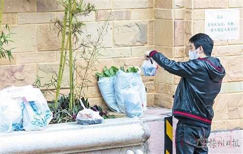 市民在梅城一小区无接触配送点拿外卖。(林翔 摄)