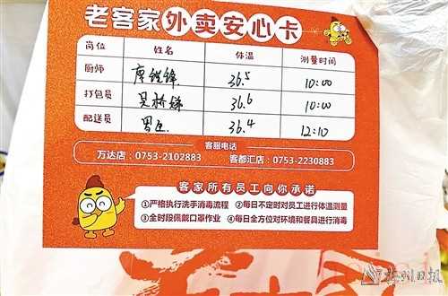 老客家则是一家主打轻食客家菜的时尚餐厅,针对年轻客群的需求,品牌推出“一人套餐”,由顾客自行选择菜品。在做好防护措施和门店管理的基础上,该公司在门店设置了无接触外卖打包台,方便配送员或顾客取餐,减少接触,每一位配送员都必须进行测温和酒精消毒,再送餐到顾客指定的地点。每份外卖还配备了“食品安全带”和“外卖安心卡”,卡上记录了厨师、打包员、配送员等人的姓名、体温等信息,让“宅”在家的顾客拿得放心、吃得安心。
