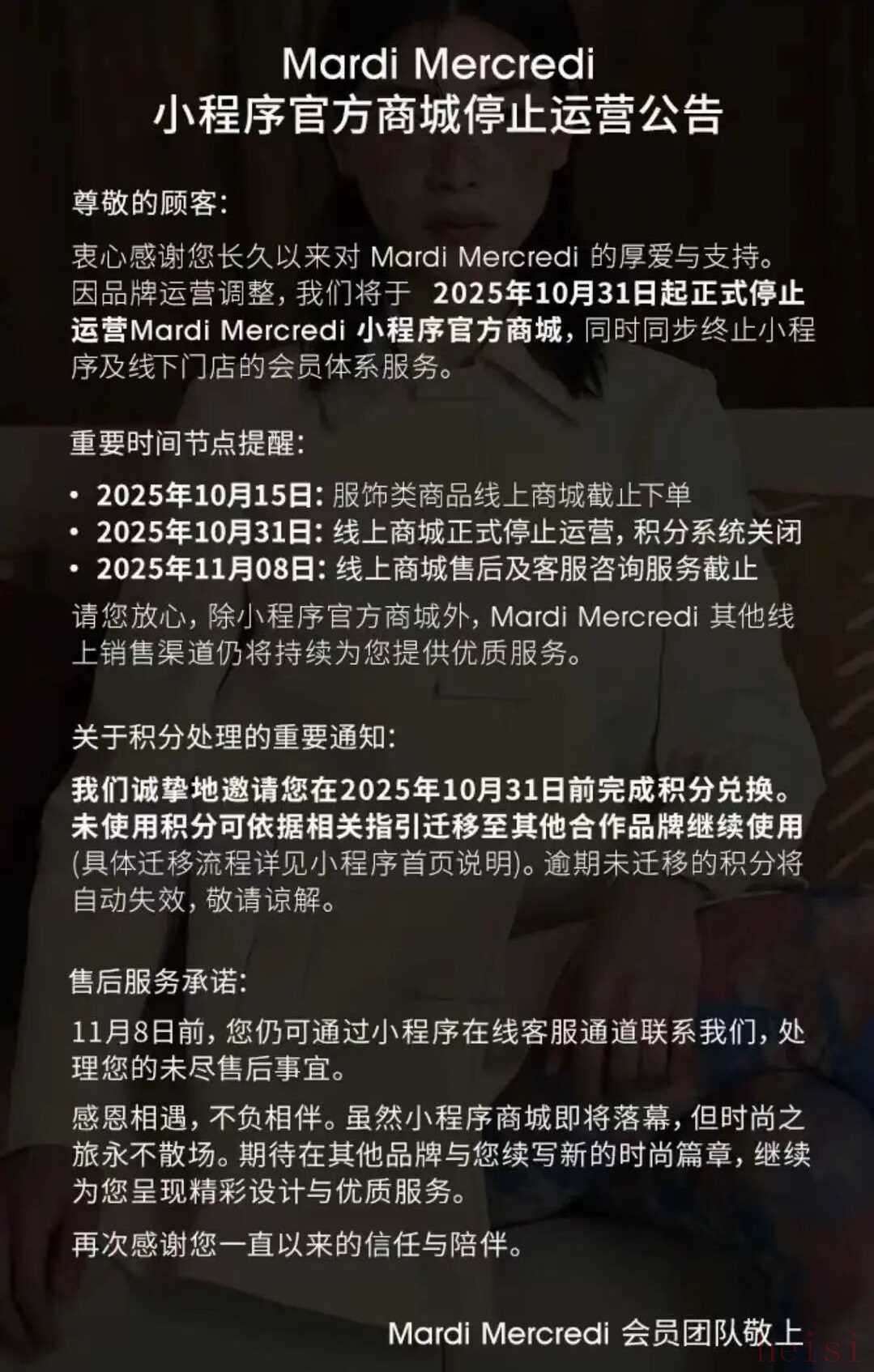 在线上渠道,Mardi Mercredi品牌微信小程序官方商城也发布通知称,商城将于10月31日起停止运营,同时同步中止小程序及线下门店的会员体系服务。