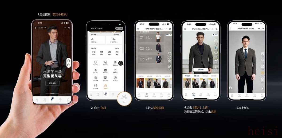 欧定的技术探索并未止步于尺码定制。在今年的秋冬新品发布会上,他们进一步推出了AI线上试衣与搭配功能。用户只需上传个人照片,即可在线试穿品牌所有款式的服装。该系统不仅能生成静态的试穿效果图,还能生成动态视频,1:1还原服装的上身效果和动态质感。这从根本上解决了线上购衣如同“开盲盒”的痛点,极大地降低了消费者的试错成本。