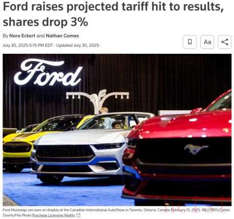 福特首席执行官吉姆·法利近期表示,“光是今年的关税,就让我们预期利润缩水超过20亿美元,更多项目被迫搁置”。公司首席财务官约翰·劳勒也进一步透露,第二季度因关税造成的成本支出高达8亿美元,全年影响预计将高达30亿美元以上。