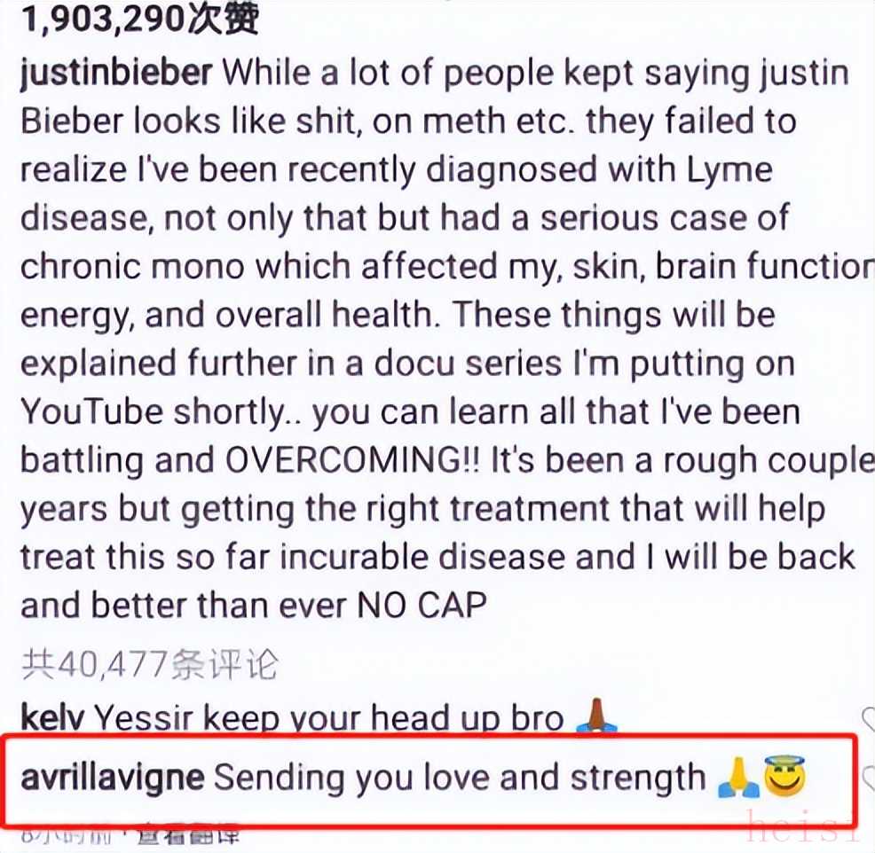 同样患有莱姆病的还有贾斯汀比伯,此前比伯被媒体数次拍到出入医院,从而引起了大家的关注,之后艾薇儿在网上发文力挺比伯,希望他能早日康复。