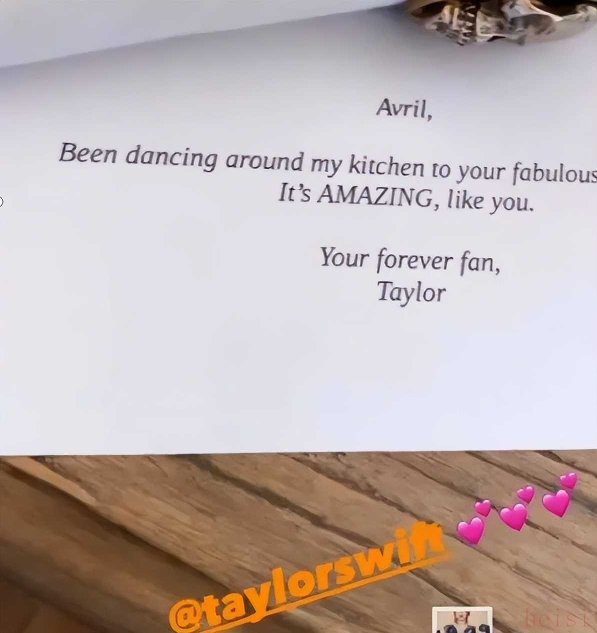 写着:“艾薇儿,我一直在厨房里跳舞,听着你美妙的新专辑!!你永远的粉丝,泰勒。”