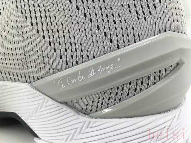 而这款薄荷绿的配色也算是比较稀少的球鞋颜色,,鞋跟处还有库里手写“I can do all things…”的不屈信念。