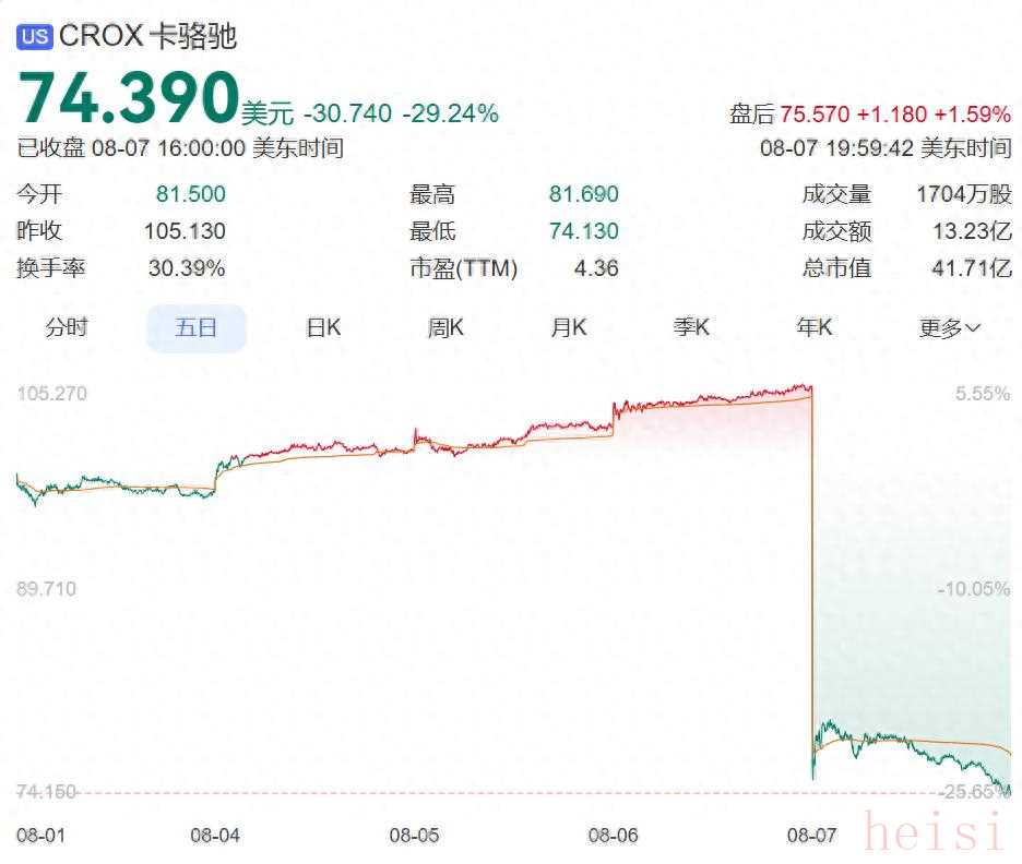 当地时间7日,“洞洞鞋”制造商Crocs(卡骆驰)发布业绩指引,第三季度营收预计将同比下降9%至11%。受此影响,Crocs股价一夜之间暴跌近30%,报收74.39美元,触及近三年来的最低点,也是其近十多年来最大单日股价跌幅。总市值仅剩41.71亿美元。