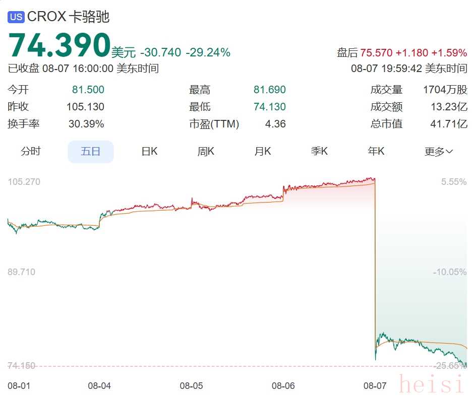 当地时间7日,“洞洞鞋”制造商Crocs(卡骆驰)发布业绩指引,第三季度营收预计将同比下降9%至11%。受此影响,Crocs股价一夜之间暴跌近30%,报收74.39美元,触及近三年来的最低点,也是其近十多年来最大单日股价跌幅。总市值仅剩41.71亿美元。目前,股价已稍有回升,但仍不乐观。