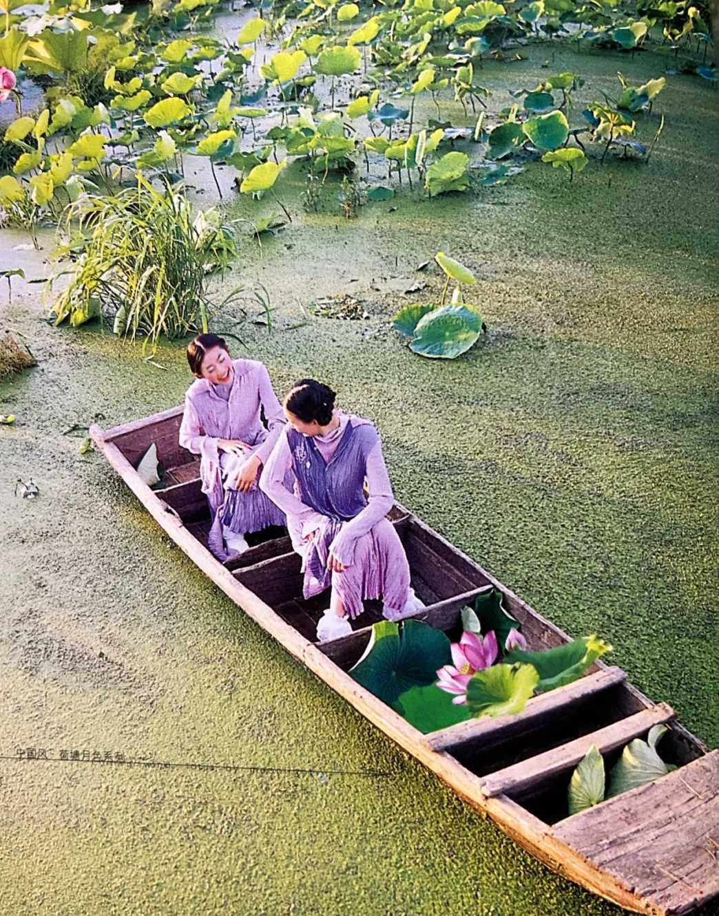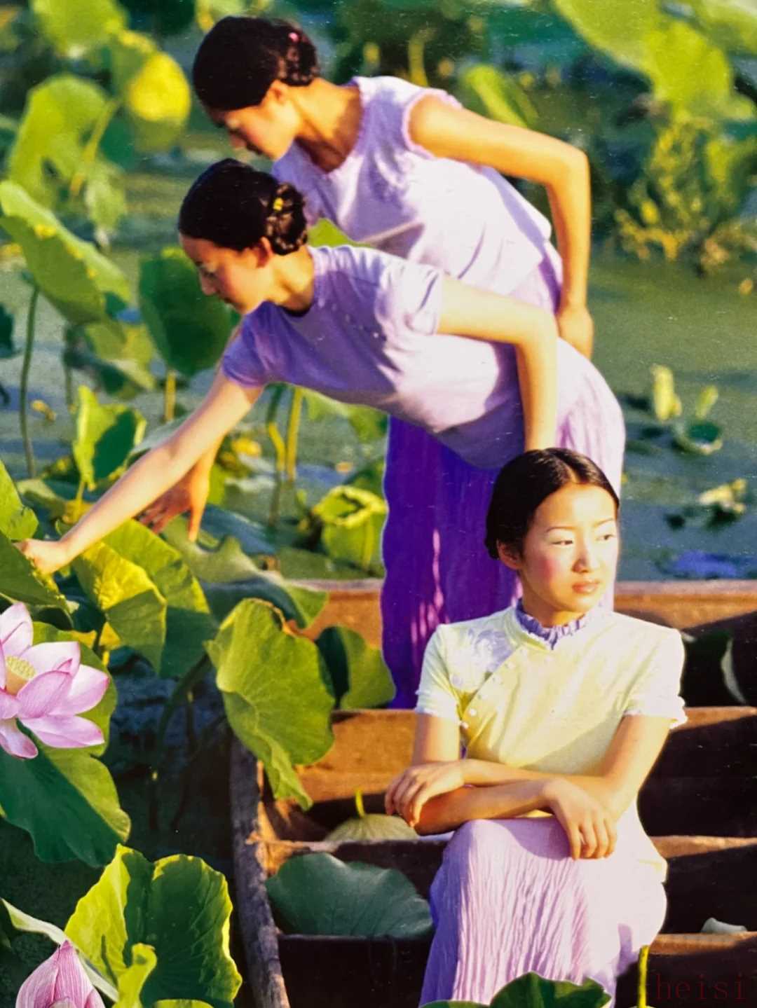 少女们梳着或盘起传统的发式,身穿荷花刺绣的改良的旗袍上衣,在开满碧荷的池塘中,尽显东方古典神韵,意境十足。
